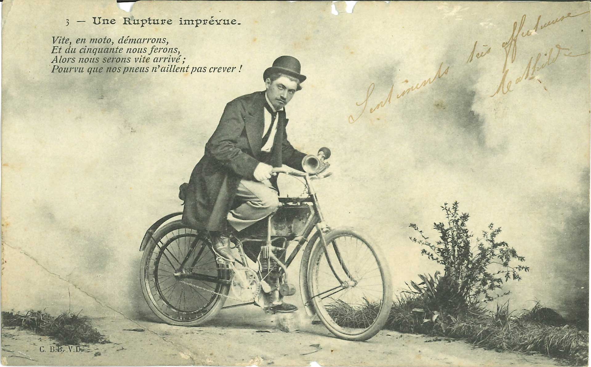 Cette carte postale témoigne d’une critique des nouvelles techniques, illustrée par l’arrivée des premières motocyclettes dans la société française. Comme le texte l’indique sur la carte postale, elle met en scène de façon ironique, un cycliste confronté aux pannes mécaniques imprévues, encore très fréquentes à l’époque.